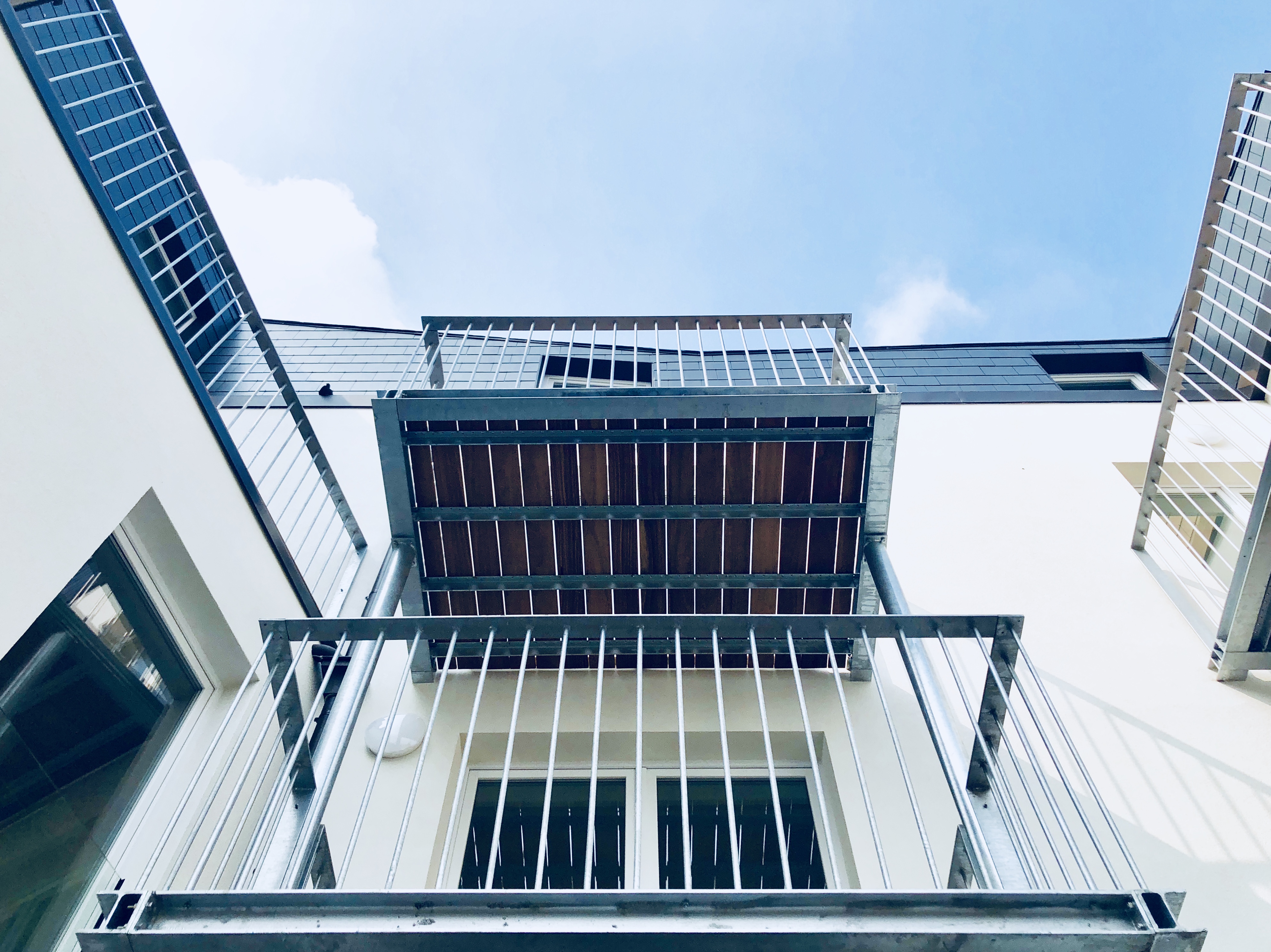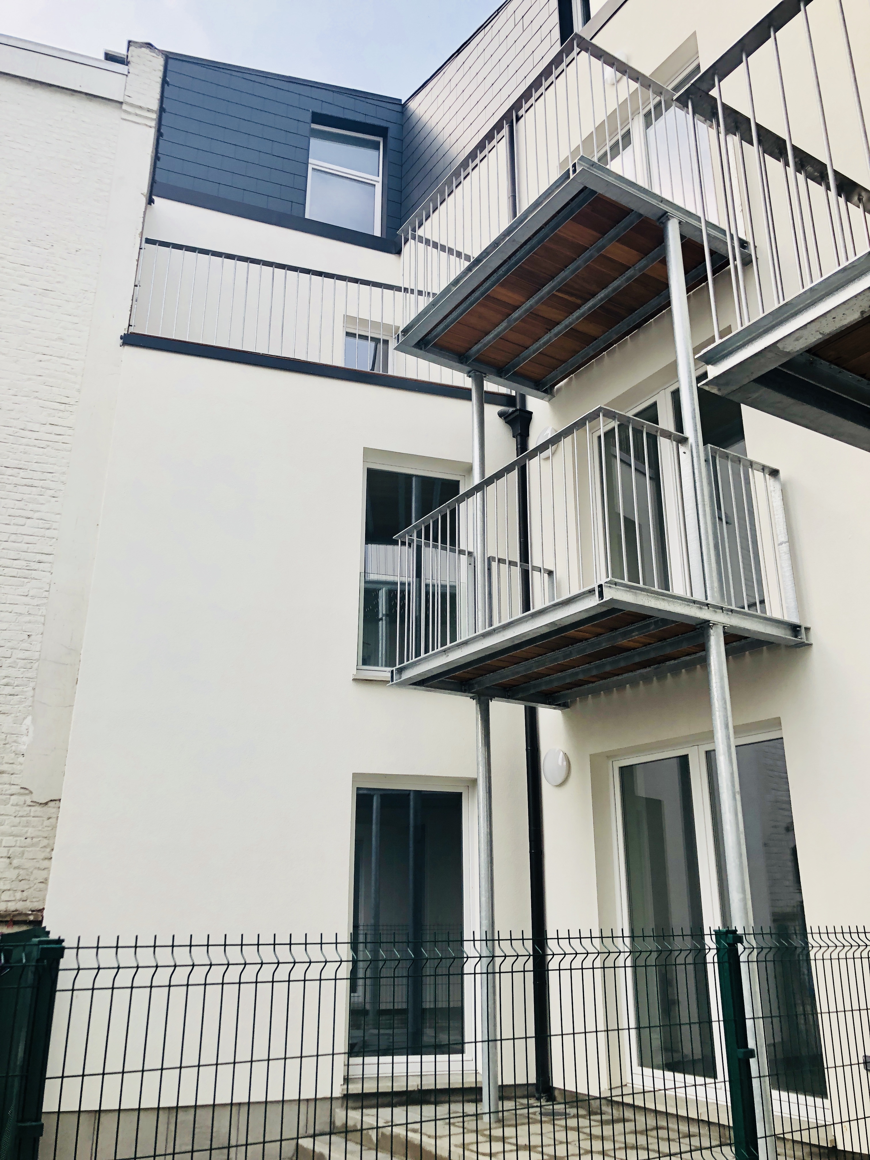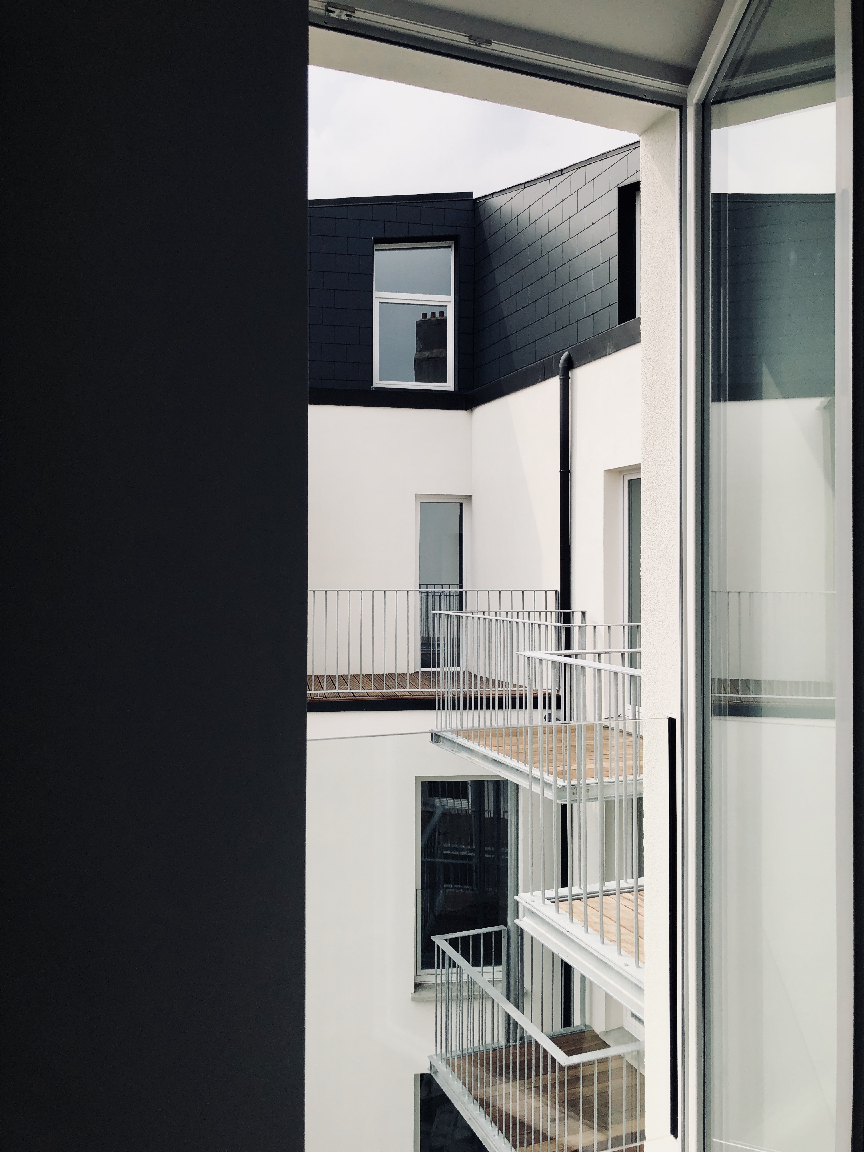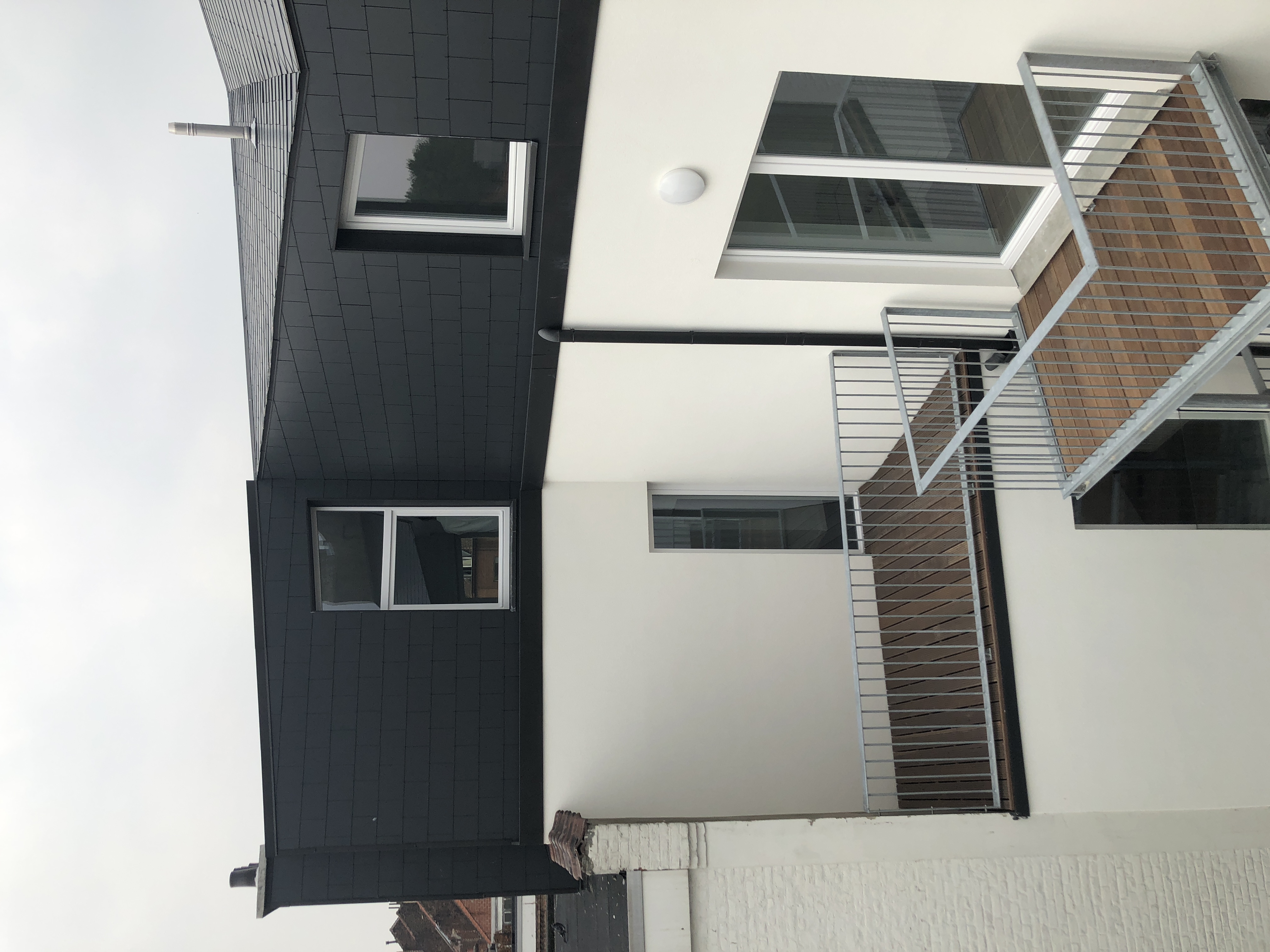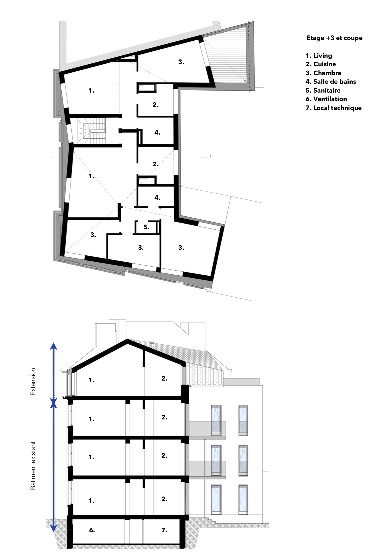 De uitbreiding op het dak is uitgevoerd in een lichte constructie in houtskeletbouw die een extra oppervlakte van 166 m2 bezet. De renovatie van de woning staat toe om de standaard lage energiewaarde te behalen (60kWh/m2 jaar). Door een keuze te maken in technische interventies die duurzame materialen naar waarde schatten, zijn we erin geslaagd de standaard lage energiewaarde te behalen (60 kWh/m2 an), en de brand- en akoestische normen te beantwoorden. Dit werd mogelijk gemaakt door op een rationele manier de woningen te herschikken.