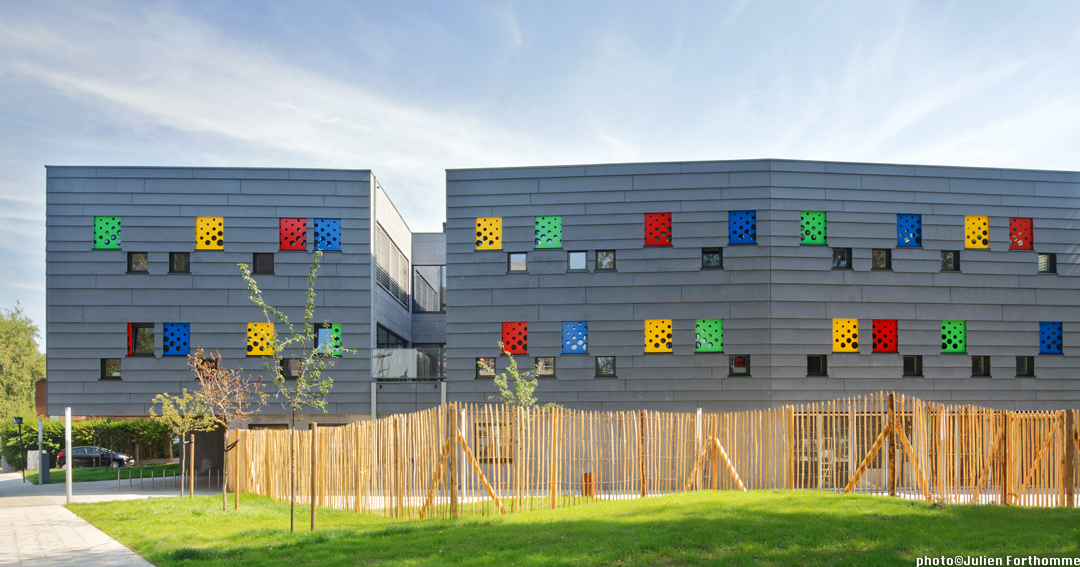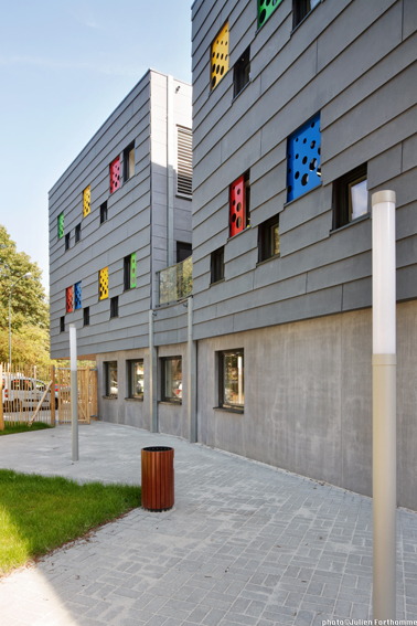 Le retrait par rapport à la voirie, les décrochements et la dynamique des façades participent à l'expression d'un bâtiment public dans un quartier résidentiel. L’aspect ludique des façades fait référence à ses utilisateurs : les maternelles.