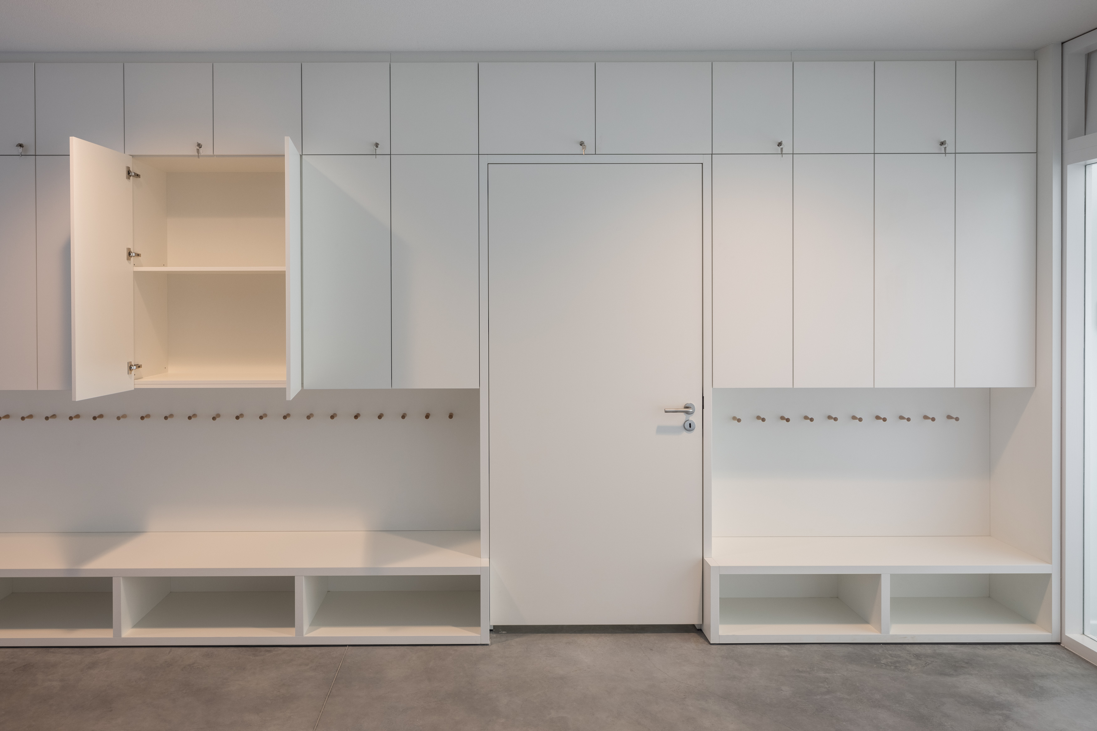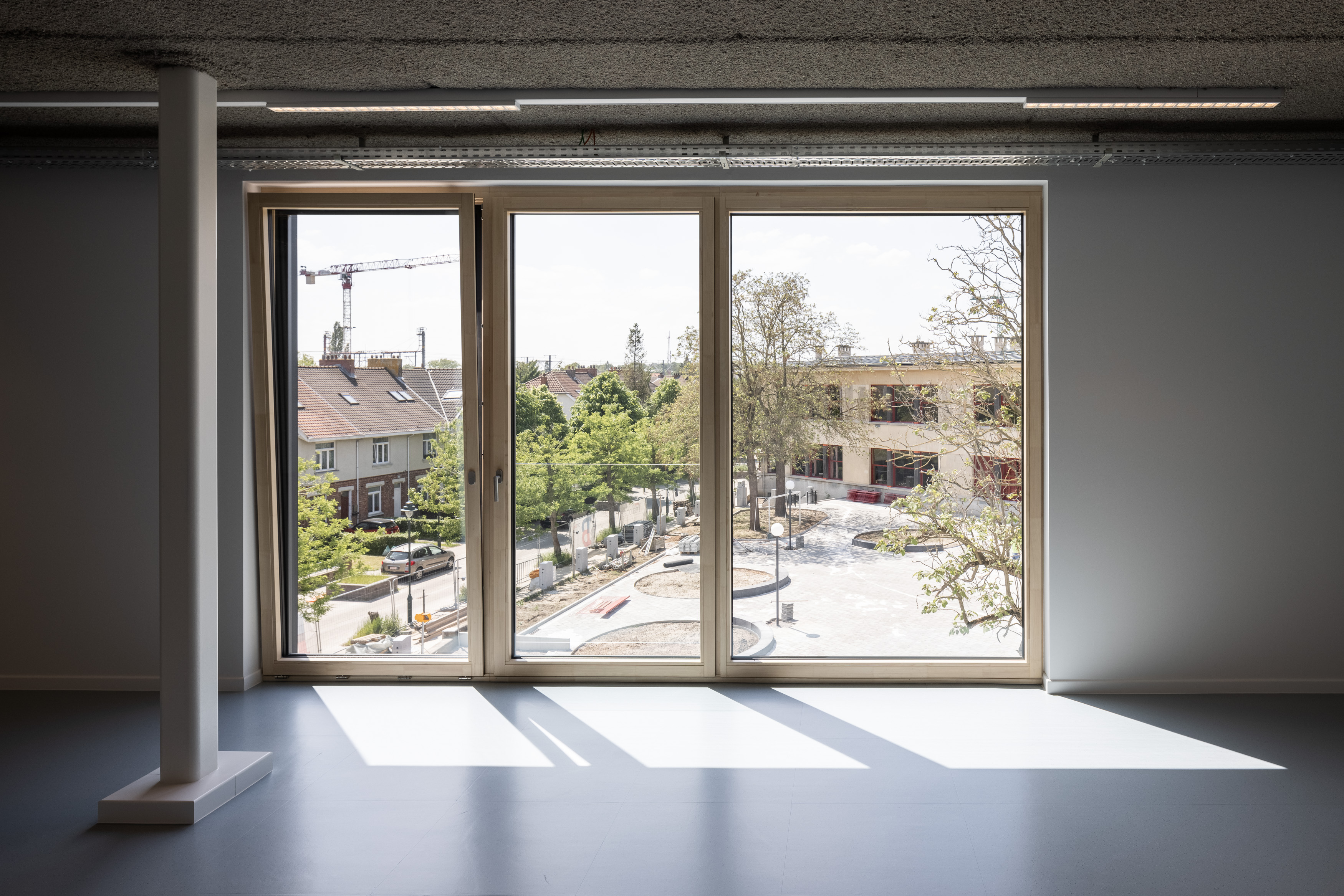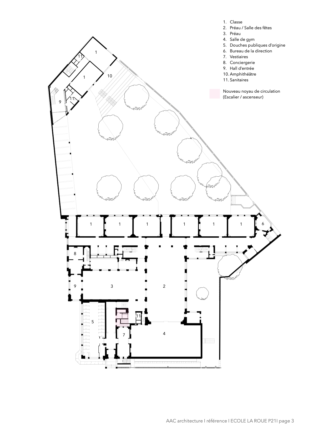 L'école de La Roue a été construite en 1935 sur base des plans de l'architecte communal Henri Charles Wildenblanck. Le nouveau bâtiment qui acceuil les classes maternelles s’intègre en respectant les lignes du contexte urbain et exprime sa fonction de bâtiment public. Les surfaces nécessaires pour les nouveaux locaux sont réparties en deux volumes distincts, en léger décalage l’un par rapport à l’autre. Le décalage renforce le sentiment que le bâtiment qui contient les classes maternelles « flotte » dessus la cour et se distinct des services destinées aux élevés de primaires au sous-sol. Le nouveau bâtiment, haut de quatre niveaux, est très compact. L'occupation au sol est moindre que les éléments démolis, ce qui permet de conserver l'intégralité de la surface de cour. Les façades sont épurées. Les ouvertures sont étudiées pour offrir un maximum de lumière naturelle aux classes tout en limitant les surchauffes.