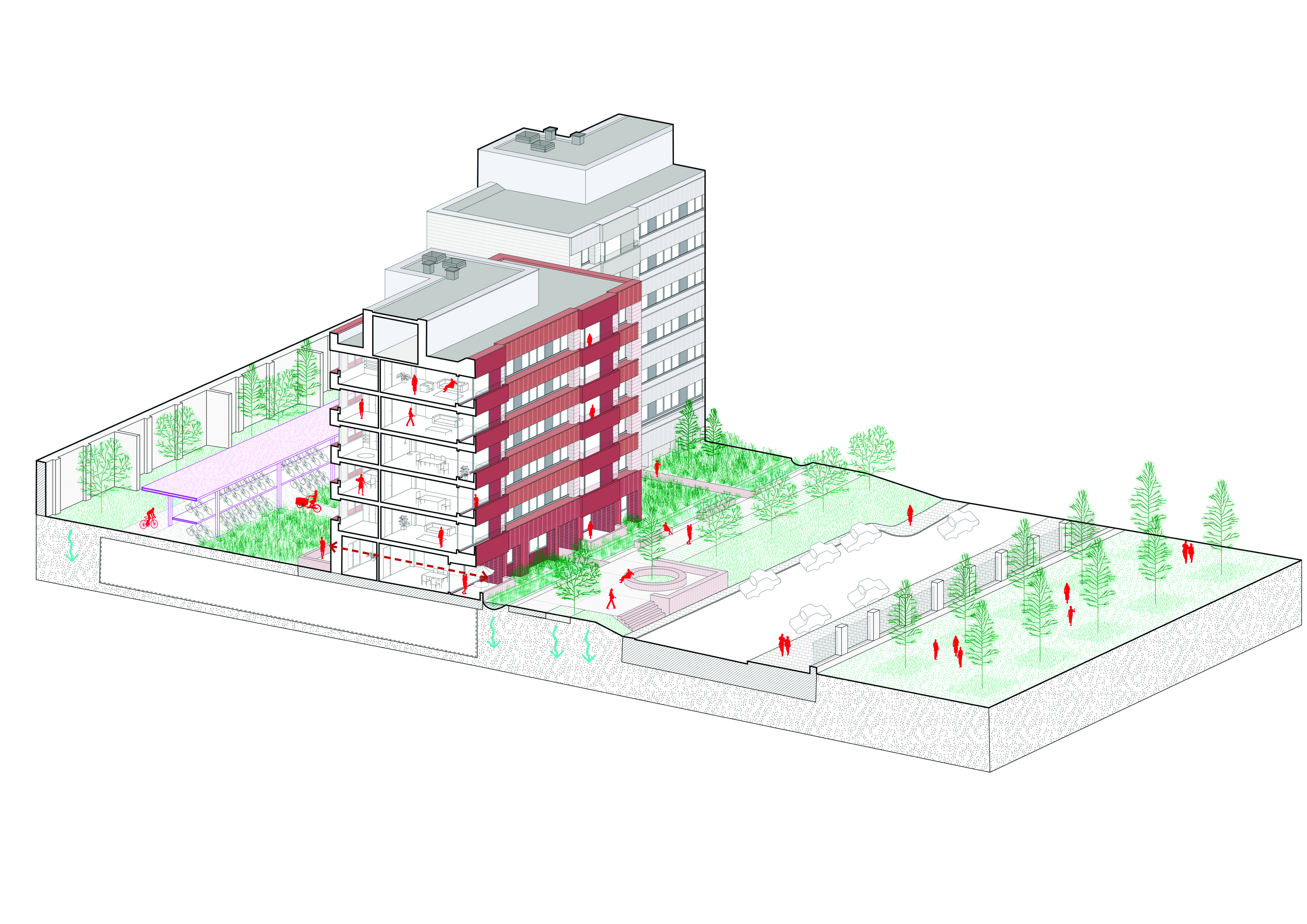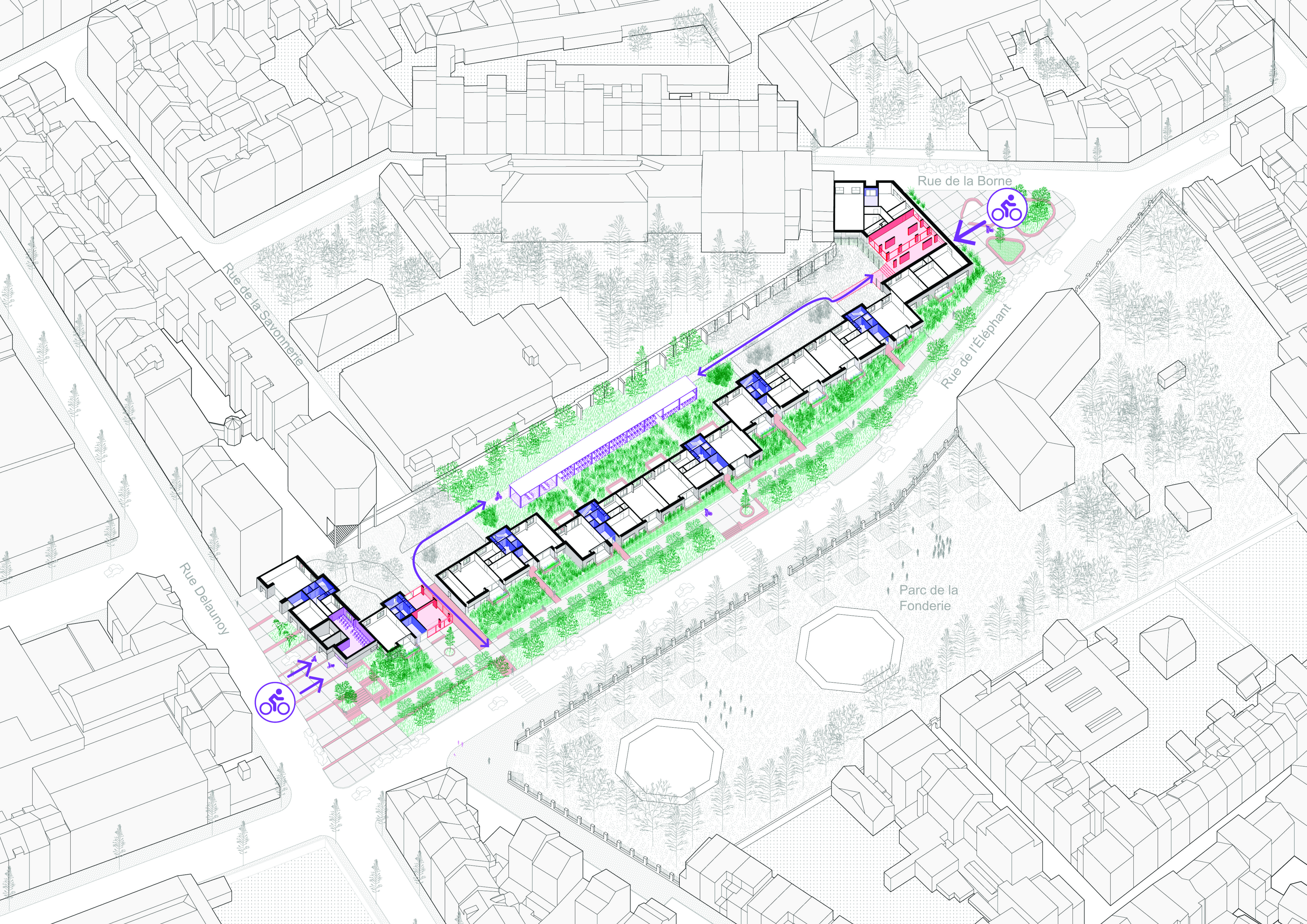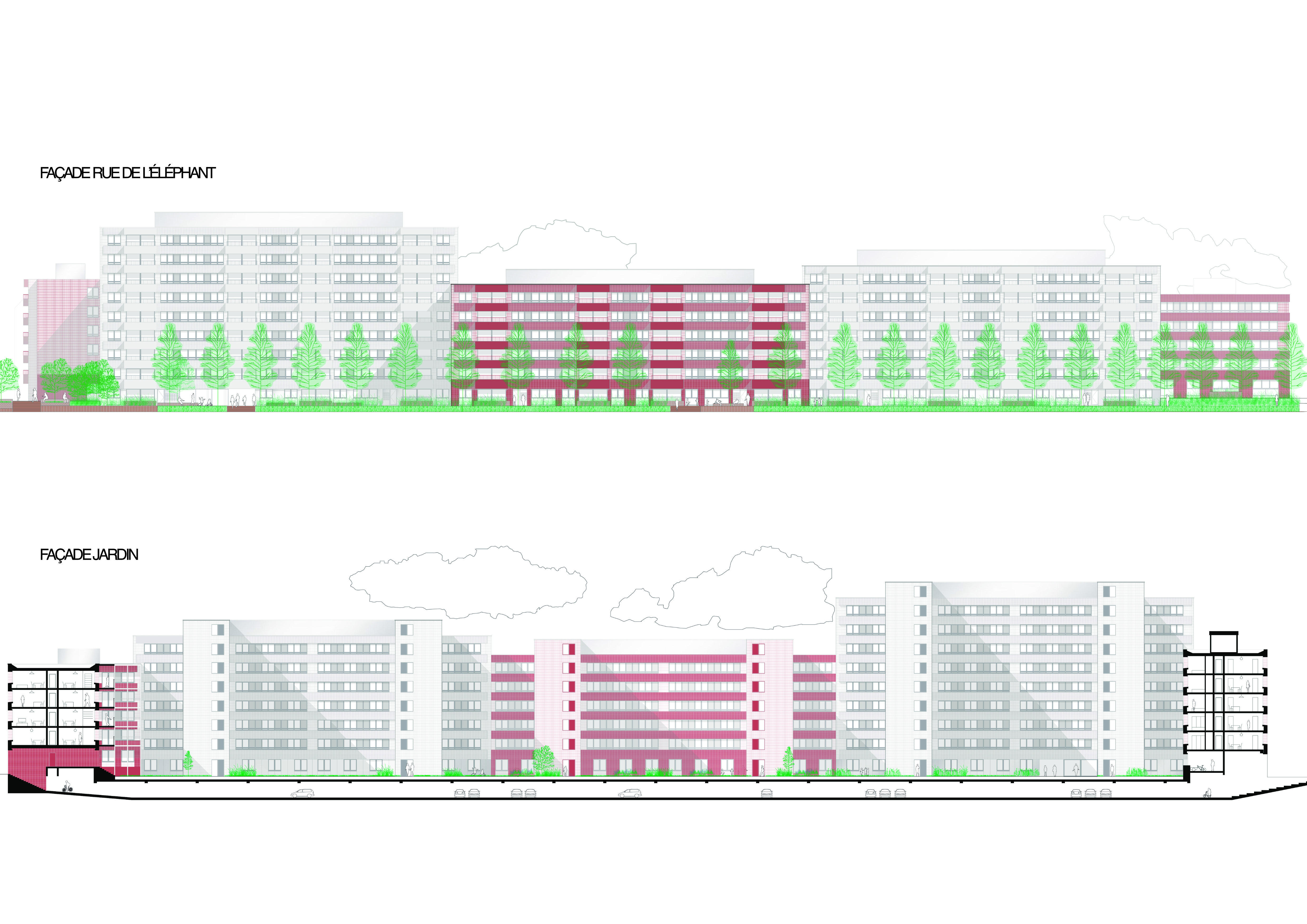 Le projet concerne 193 logements repartis dans trois immeubles le long de la rue de l'Éléphant, face au parc de la Fonderie. Le mode constructif consiste à envelopper les balcons existants avec une isolation extérieure, plutôt qu'une solution nécessitante démolition et reconstruction. Les caissons seront habillés d’un revêtement de façade indépendant, composé de panneaux en fibre-ciment recouverts d’éléments céramiques, disposés selon un calepinage au format de briques, apportant à la fois du caractère et une échelle plus humaine aux immeubles.