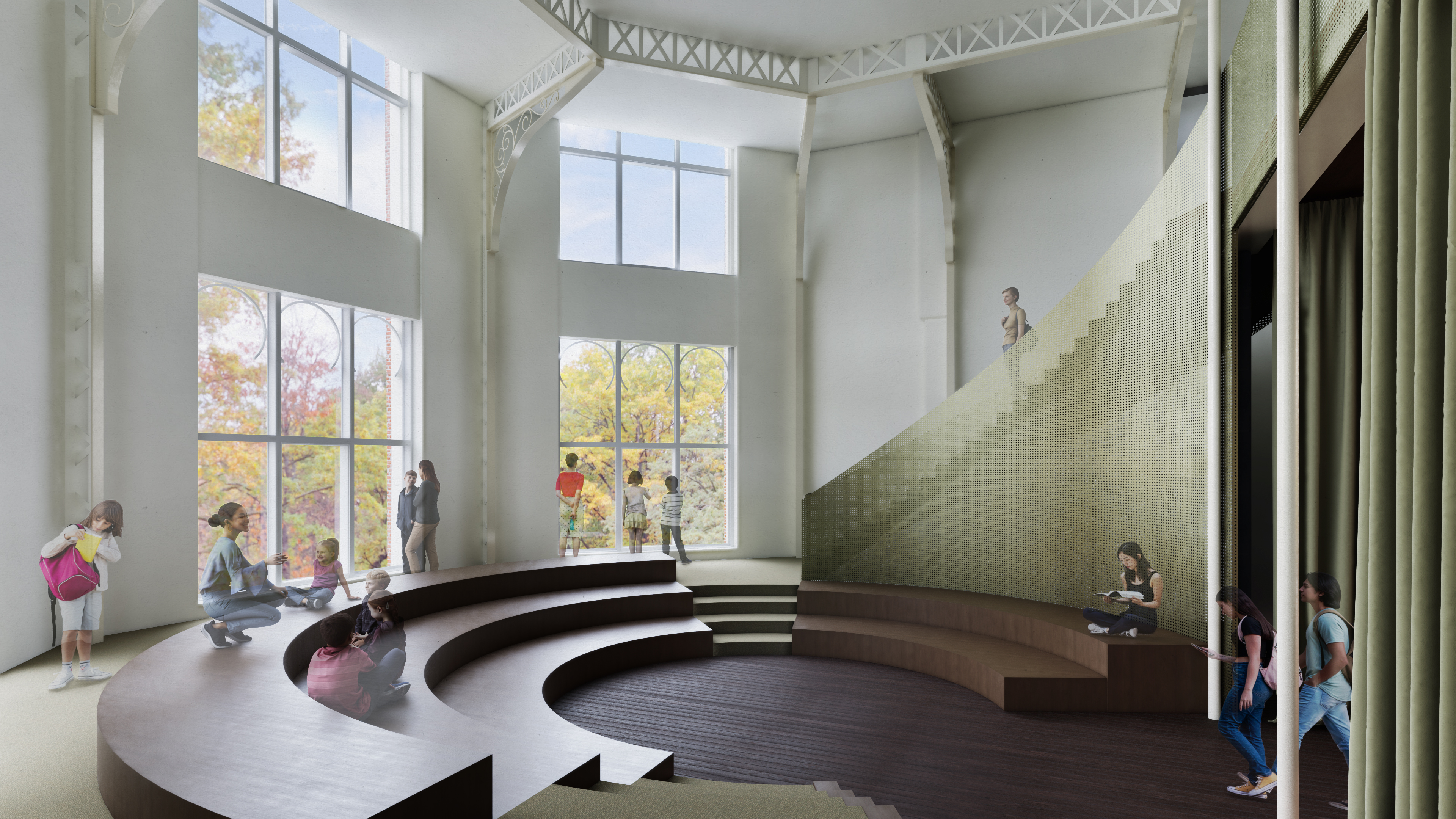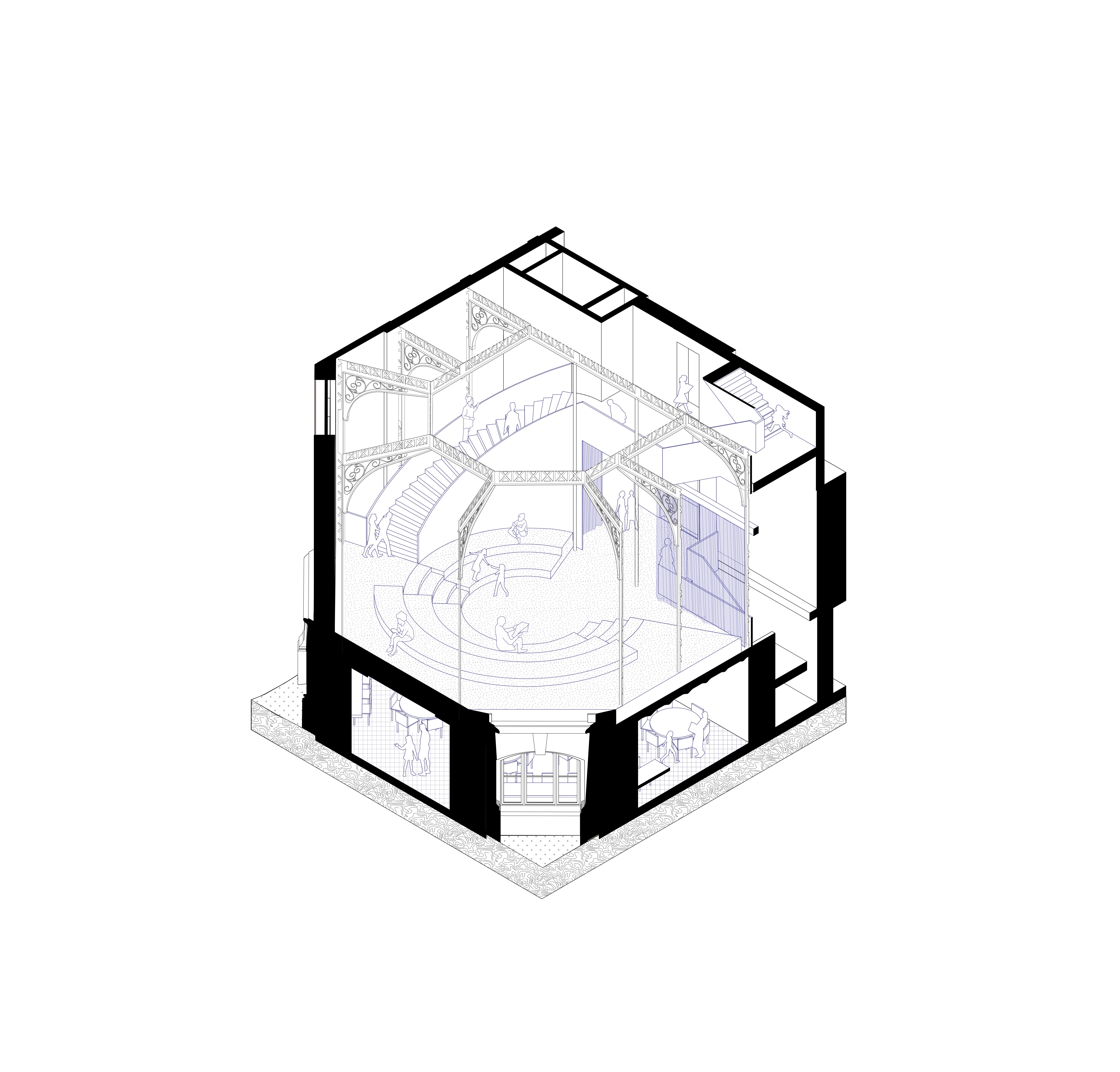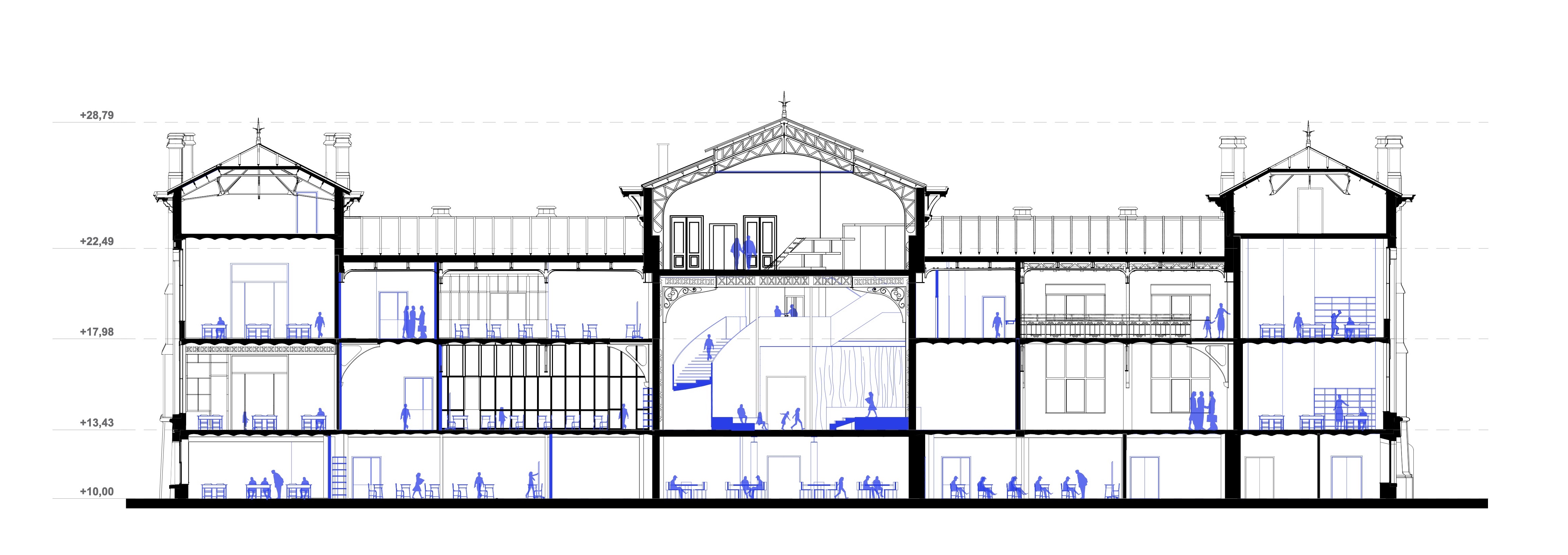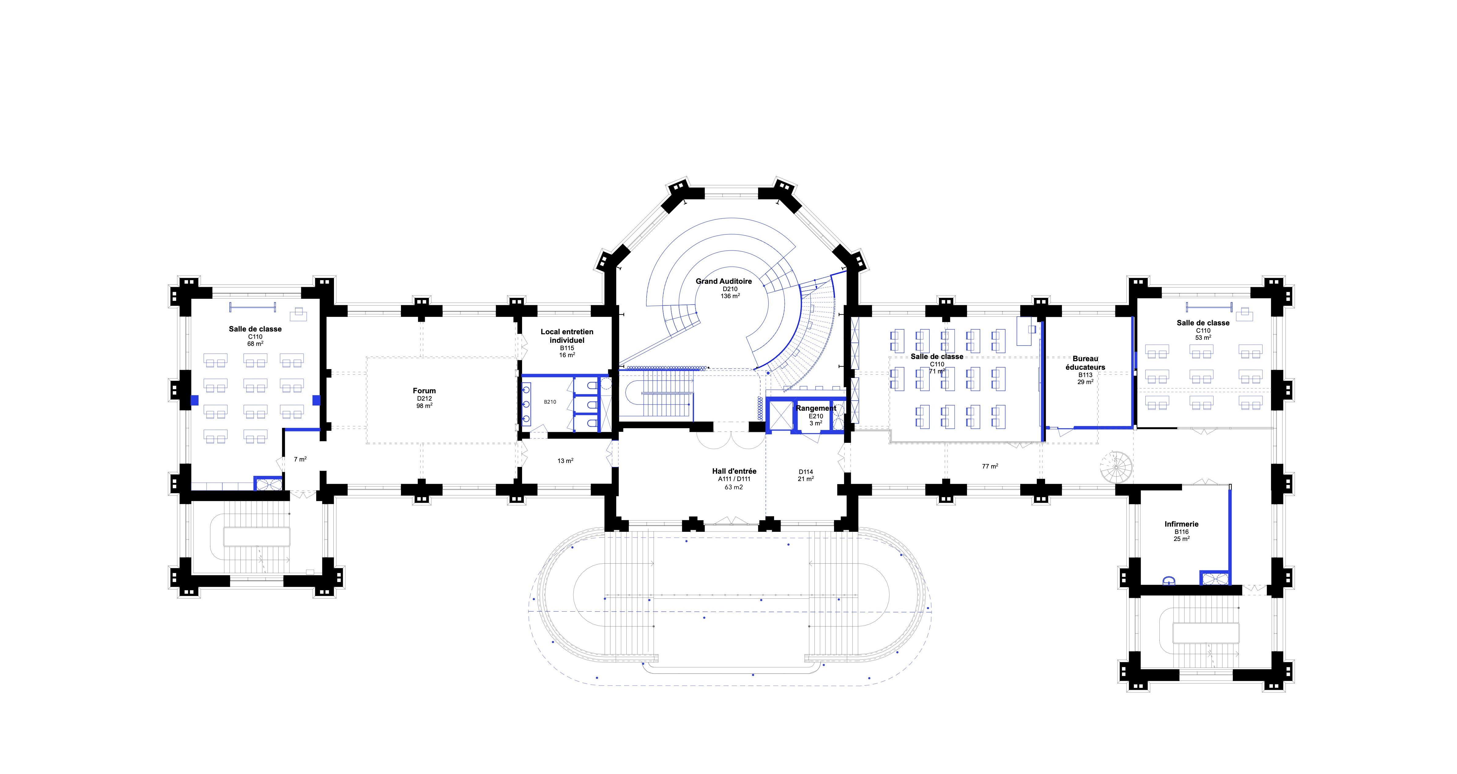 Il s'agit d'un projet vivant et évolutif, qui répond aux nouveaux besoins d’une école de premier cycle. Le théâtre anatomique qui présente une haute valeur architecturale et historique est préservé et restauré à l’identique. L’auditoire, de moindre valeur et n’ayant jamais trouvé de réel usage, est réinterprété. L’ancien auditoire, situé au centre du bâtiment et attenant au hall d’entrée, est ré-ouvert et devient un point névralgique de distribution entre tous les lieux de l’école : la bibliothèque, le réfectoire, les classes. Le nouveau gradin circulaire (à l’image du théâtre anatomique original) permet de s’y installer le temps d’une pause ou lors de rassemblements.