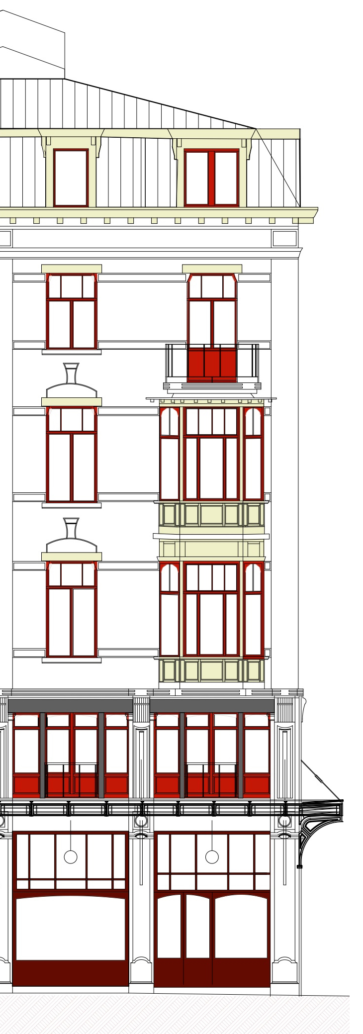 Cette rénovation énergétique est exemplaire et illustre ce qu'il est possible de faire dans un ensemble partiellement classé. Le bâtiment est dans un état structurellement fidèle à l’original avec un plan d’étage très simple et très souple. Les décors et les plafonds anciens sont conservés. Le projet conserve la structure du bâtiment de manière à garder la lisibilité du plan. Les affectations sont adaptées aux nuisances nouvelles : les chambres sont déplacées à l’arrière.